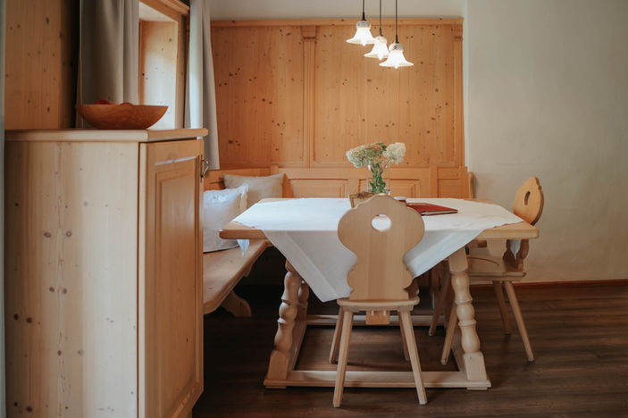 Zweistöckige Ferienwohnung im Landhausstil, mit großzügigem Wohnbereich, Balkon und einem hellen Atelier. Wohn-Schlafraum aus einheimischem Zirbenholz. Beliebt bei Familien.